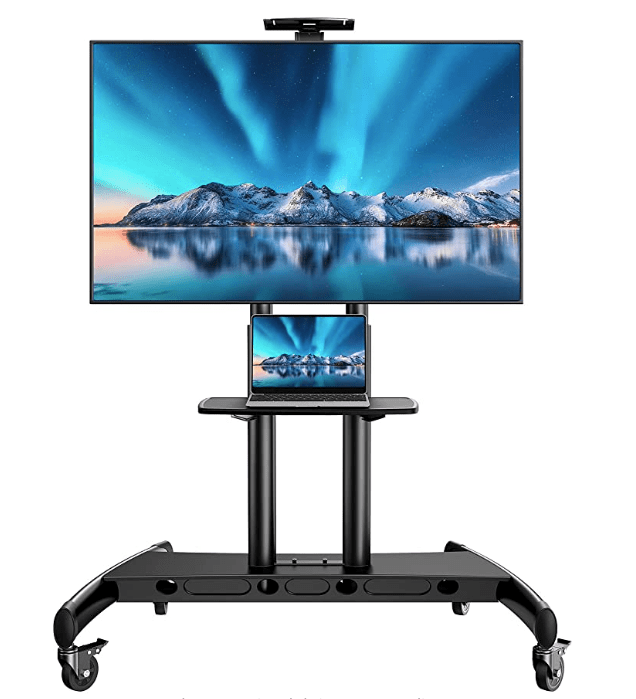 Soporte de TV móvil para TV de 55 a 90 pulgadas de pantalla plana/curvada máxima VESA 31.496 x 19.685 in para exteriores con estante AV de altura ajustable, soporte de TV con suelo rodante certificado UL con capacidad para hasta 200 libras